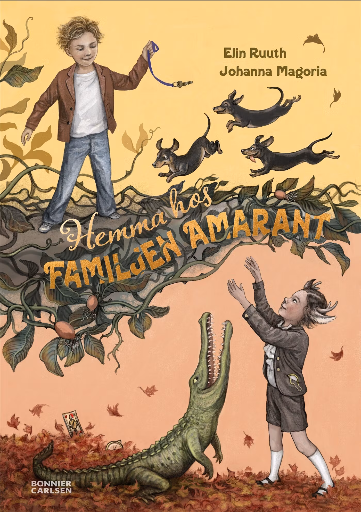 BYTA SKOLA, står det högst upp på Neos önskelista. I veckor har han tjatat på sina föräldrar om att få gå trean utomlands, tillsammans med bästisen Poppel Amarant. Men när den efterlängtade nioårsdagen är över och den sista presenten har öppnats, säger Neos föräldrar fortfarande nej.Gissa om Neo blir överraskad när barnen Amarant i stället börjar i hans skola, i Sverige! Äntligen har mormor Maggan kommit på besök med sju skälliga taxar och minst lika många moderna idéer. Nu börjar ett helt nytt liv för Poppel, Mistel, Tistel och lilla Hassel. Men det är inte alla som välkomnar förändringen."Hemma hos Familjen Amarant" – den tredje boken i trilogin om Amaranterna – är en rolig, vemodig och alldeles underbar kapitelbok om att längta bort och hitta hem. En magisk saga om gamla vanor, nya traditioner och konsten att ta hand om varandra.Elin Ruuth och Johanna Magoria delar kärleken till finstämda absurditeter och sorgkantad humor, och arbetar omsorgsfullt med ordens och bildernas detaljer, stämningar och djup.