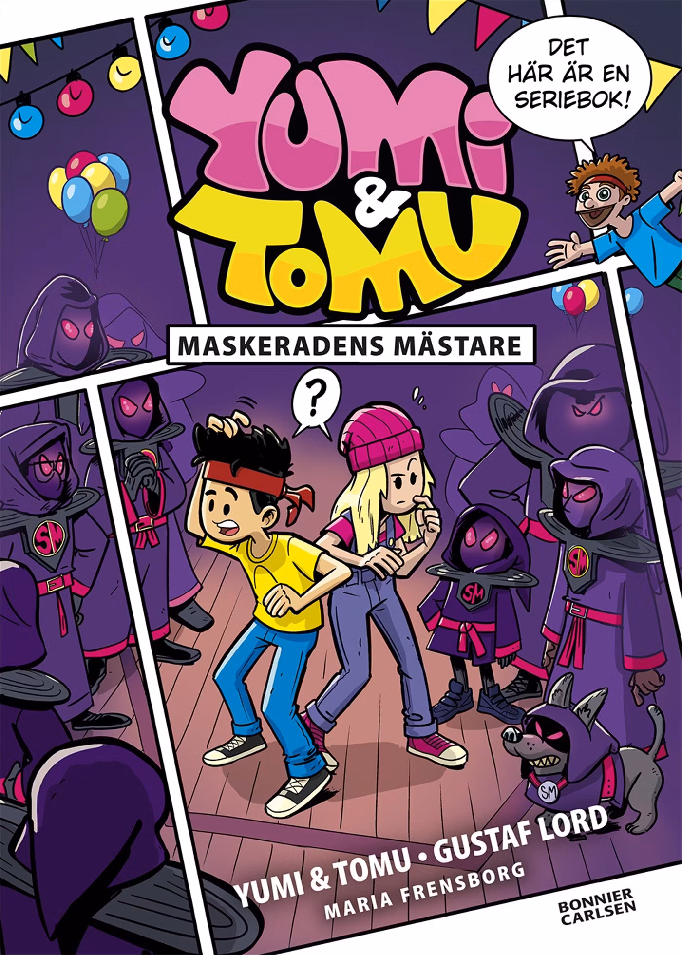 När Yumi och Tomu ska på maskerad är det mycket som måste fixas och pysslas i Pandaihuset. Tomu ska klä ut sig till självaste Spelmästaren medan Yumi har en hemlig, giftgrön idé. Senare på maskeraden upptäcker de att någon saboterar festen. Men hur hittar man den skydliga bland alla superhjältar och monster? Böckerna om Yumi & Tomu är generöst illustrerade av Gustaf Lord. I den här serieboken får hans bildberättande ta ännu större plats. Med lättläst text i rutor och pratbubblor är det en perfekt bok för nybörjarläsare som gillar humor.Yumi & Tomu är youtubers från Uppsala som blivit otroligt populära. Genom att göra roliga och kärleksfulla videor vill de skapa underhållning för barn, med snällare tilltal än mycket annat som finns på Youtube.