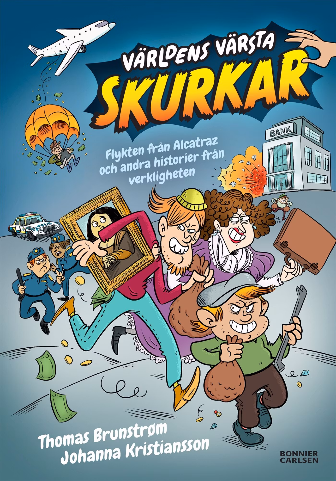 Känner du till historien om flykten från fängelset Alcatraz? Eller har du hört om mannen som stal Mona-Lisa, världens mest berömda målning? I Thomas Brunstrøms underhållande och lättlästa true crime-bok kan du läsa om fascinerande brott genom världshistorien. Häpnadsväckande historier om smarta stötar och fräcka bedrägerier blandas med osannolika rymningar från fängelser. Här överträffar verkligheten fantasin! Allt illustreras med Johanna Kristianssons härligt humoristiska bilder. En bok för alla som gillar spänning och vill läsa om sånt som hänt på riktigt! Det här är första boken i serien "Världens värsta skurkar" av den danska, prisbelönta barnboksförfattaren Thomas Brunstrøm. Han har skrivit över 30 böcker för barn och är dessutom journalist och filmkritiker. Johanna Kristiansson är serietecknare och flitigt anlitad illustratör av böcker för unga.