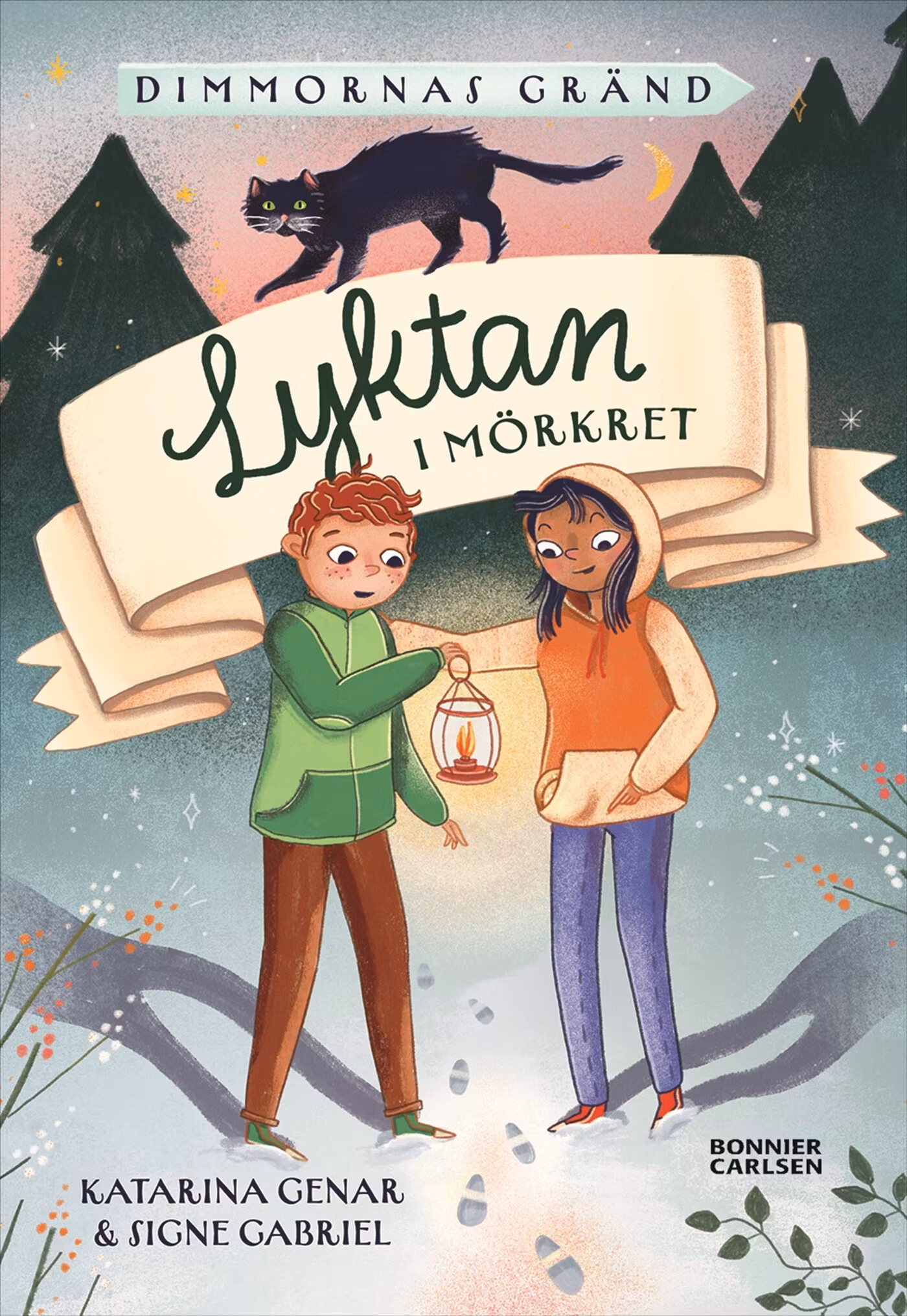 Dante och Paloma sitter på Borgs konditori i ”Dimmornas gränd”. Där finns de godaste bullarna och tårtorna. Det visar sig att Selma som bakar dem har en hemlig receptbok. Inte undra på att allt är så gott! Plötsligt tätnar dimman utanför. Just när Dante ska hjälpa till att tända den gamla lyktan vid dörren, skriker Selma från köket. De springer dit. Recepten i den hemliga receptboken håller på att försvinna! Hur är det möjligt? I samma stund börjar kyrkklockorna att slå och Dante och Paloma sugs in i receptboken. Allt snurrar fortare och fortare. När de landar är det mörkt och kallt. I handen har de lyktan och en nygräddad bulle …”Lyktan i mörkret” är den andra fristående boken i Katarina Genars serie ”Dimmornas gränd”, om kompisarna Dante och Paloma som kan färdas i tiden. Det här är lättlästa, spännande kapitelböcker om tidsresor och magiska ting. Stämningsfullt, naivistiskt och suggestivt illustrerade i underbara färger av Signe Gabriel. Läs också: ”Den vita fjädern”.KATARINA GENAR har förmågan att skriva kort och lättläst med ett rakt och klart språk, samtidigt som hennes berättelser ofta är gåtfulla och spännande. Hon har trollbundit läsare både med sina fristående mellanåldersböcker och sin lättlästa serie om "Mystiska skolan". SIGNE GABRIEL är en dansk illustratör. Hon är utbildad i visuell kommunikation vid Malmö Universitet och i semiotik vid Aarhus Universitet. Hon har tidigare gjort illustrationer till bland annat appar, utbildningsmaterial och barnböcker.