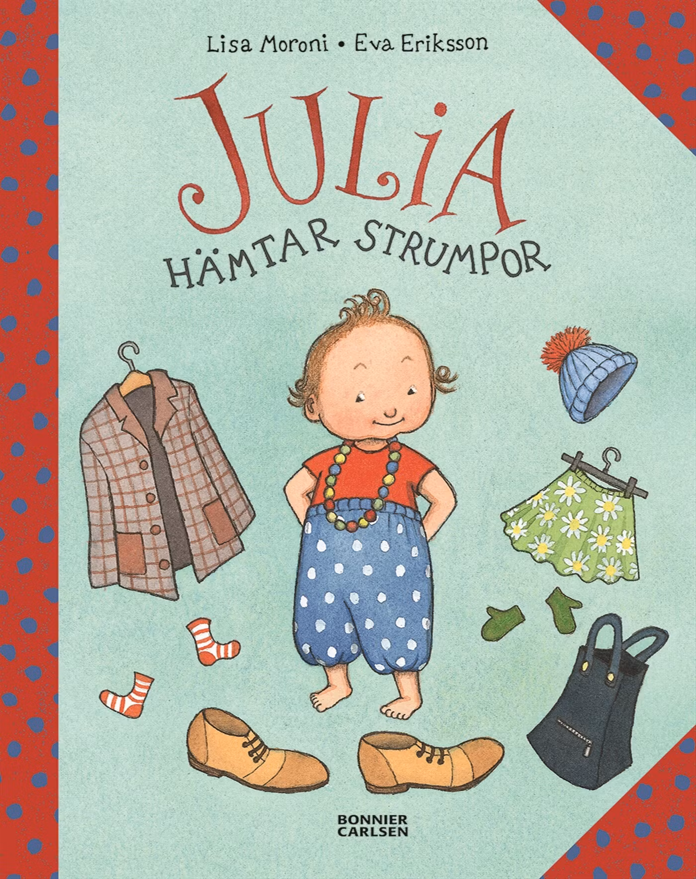 Var är strumporna? Eva Eriksson och Lisa Moroni (mor och dotter) har skapat en serie varma och mysiga småbarnsböcker om oemotståndliga Julia. Här är alla med: mamma, pappa, mormor, hunden och såklart charmtrollet Julia! Busig och lekfull läsning om hur roligt man kan ha med kläder. För tvååringar och deras familjer. Julia kan hämta strumporna själv. Hon vet var de finns. Nu kommer hon! Klamp, klamp. Nej, det där är väl inte strumporna … Julia trampar iväg igen. Men vad är det hon kommer med? Mamma, mormor, pappa och hunden tittar förundrade på.Eva Eriksson och Lisa Moroni har i Julia-böckerna arbetat ihop på ett nytt sätt. De har både skrivit texten och gjort bilderna tillsammans. Och Julia, Lisas dotter och Evas barnbarn, har stått för inspirationen. Läs också: Julia gömmer sig.