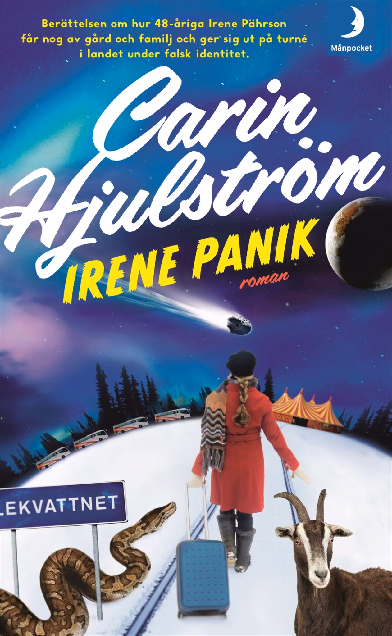 Irene Pährson är 48 år, älskar muffins och bor på landet tillsammans med sin man Björn, tre tonårsbarn, hästar, hundar, katter och en extremt missnöjd get. Som ung ville Irene bli sångerska eller bibliotekarie, men ingenting blev som hon hade tänkt sig. Nu har hon varit hemma och tagit hand om familjen och den slitna gården Grangläntan medan maken har byggt upp företaget Björns Bad i Ulricehamn. Björn brukar kalla sin fru Irene Panik för att hon jämt tar på sig att rädda allt och alla i de mest kaotiska situationer. Irene längtar efter att vidga sina vyer och bygga upp en egen identitet utanför hemmet. Ett antal besynnerliga sammanträffanden ger henne plötsligt kraft och mod att säga upp sig som familjens projektledare och ge sig ut på en äventyrlig resa. När hon avslöjar sin plan berättar Björn att han träffat en ny kvinna – Ulla på Våtrumsspecialisten. Under en härligt galen roadtrip genom ett vintrigt glesbygds-Sverige lär Irene känna en rad udda existenser som kommer att betyda mycket för henne och hon för dem. Allt detta medan en meteorit från yttre rymden närmar sig jorden med en obegriplig hastighet. Och till slut får Irene verkligen användning för sin förmåga att hantera både kaos och panik … Irene Panik är en humoristisk och tankeväckande historia om att ta tag i sitt liv och att våga omformulera sina drömmar.