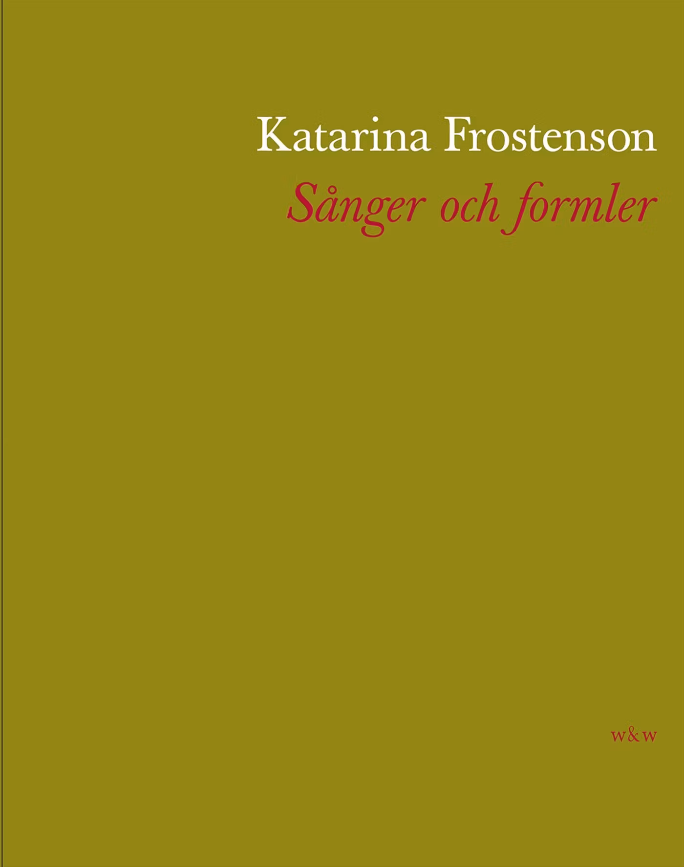 Belönad med Nordiska rådets litteraturpris 2016I Sånger och formler samsas sorgens formler och ljusets sång. Dikten färdas mot städer och utmarker, den utforskar platser och ting. Språket gör halt och lyssnar till tillvaron, hejdar sig i nakna rader.”I en tid när allt drog tungt tillbaka, gav mig poesin tiden fram. Jag kunde ge mig ut. Där fanns rum, vägar, linjer som bågnade. Där fanns rörelse. Att följa sopfloden och bråtesvägen, det som strandar vid ängar och omvandlas till okända ting. Att med ögonen hemskt, klart och lyckligt utforska vägkantens fynd. Att glömma sig själv, det är lösningen. Att stå inför ordet ’lånehunger’ och en dag se hela vidden i ’grönsiska’, att börja sin resa där. Till de sibiriska vidderna, till en rot i Minsk. Till Tomi igen och igen, orden om tomheten och allt de föder. I Tsvetajevas våld. Eller in mot din sorg. Det gick att försvinna ut, poesi.”Katarina Frostensons förra diktsamling Flodtid (2011) nominerades även den till Nordiska rådets litteraturpris. Prosaboken Tre vägar (2013) nominerades till Augustpriset.
