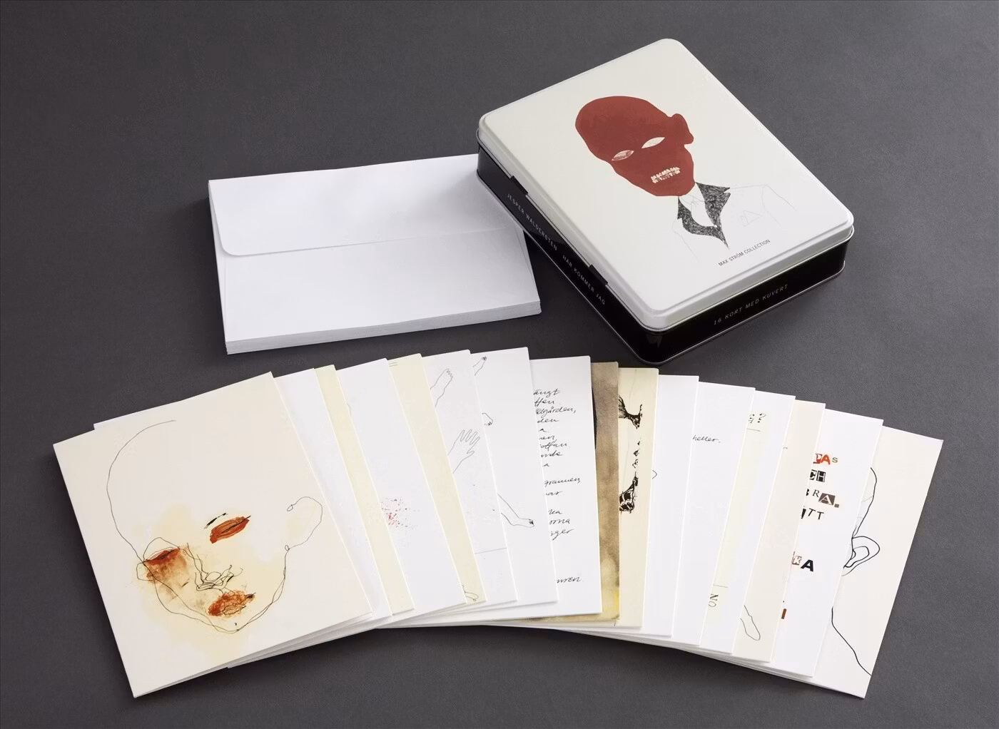 16 dubbla kort med kuvert i plåtask. Bilder ur boken Här kommer jag. Illustrationer Jesper Waldersten. Kortens format 13x18,5 cm.