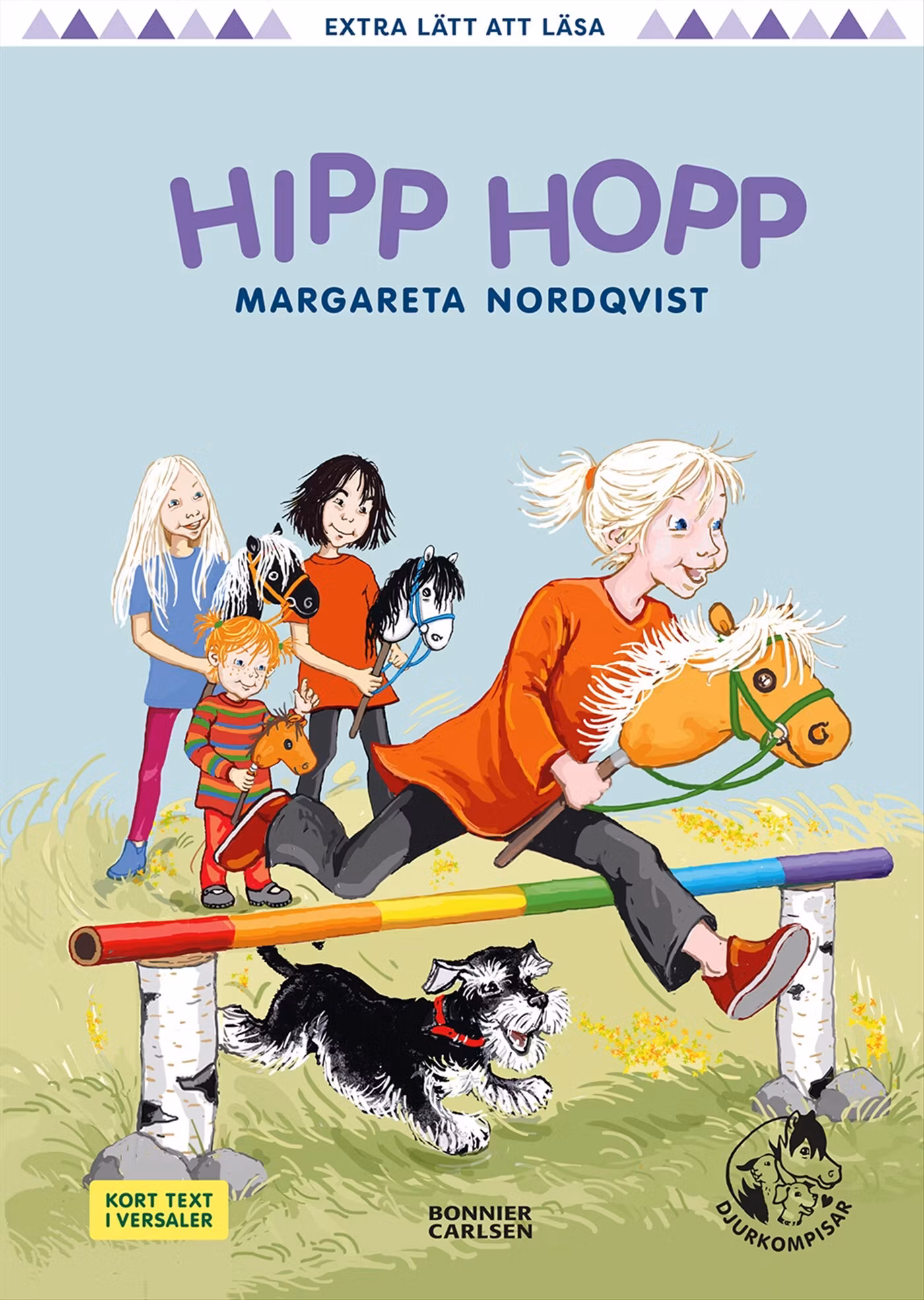 Lätt läsning i versaler för pyssliga nybörjarläsare. Hipp hopp är den fjortonde boken i serien "Djurkompisar", som passar perfekt för små djurälskare som är på väg att knäcka läskoden. Ella och hunden Bella ska hälsa på Ellas kusiner. Kusinerna älskar också djur, precis som Ella, men har inga egna. Men det går att fixa ändå genom de hemgjorda käpphästarna Pix, Pax och Pop. Med dem kan kusinerna göra allt som hör hästlivet till; rida, pyssla om och tävla. Nu vill Ella också göra sin egen käppis!Här finns både en lättläst berättelse och enkla instruktioner för den som vill tillverka sin egen käpphäst. Margareta Nordqvist, som även illustrerar de populära Sigge-böckerna, berättar i serien "Djurkompisar" om barnen Maja, Lasse, Pelle och Ella som bor på landet och tar hand om olika djur.