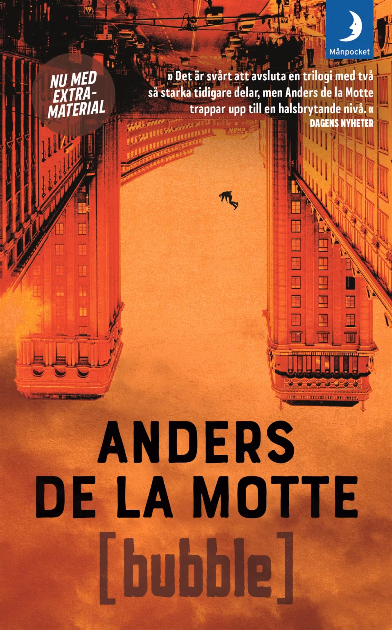 Bubble är sista delen i Anders de la Mottes hyllade trilogi. En rykande aktuell thriller om hur vi mitt i den digitala övervakningen försöker bygga trygga bubblor, som alla förr eller senare kommer att spricka.Henrik ”HP” Pettersson försöker desperat slingra sig ur Spelets järngrepp. Rebecca har påbörjat sin nya karriär på säkerhetsavdelningen i ett växande IT-imperium, men när man hittar ett mycket oroande innehåll i ett gammalt bankfack tvingas hon återigen vända sig till den mystiske Tage Sammer för att be om hjälp. Är han verkligen en gammal officerskamrat till hennes pappa, eller är det som HP påstår – att Sammer i själva verket är Spelledaren? När Stockholm än en gång rustar för prinsessbröllop hamnar HP och Rebecca på en sista dödlig kollisionskurs. Vilka är egentligen den avhoppade grupp Spelare som jagar HP? Vad vill de honom? Och om verkligheten bara är ett spel, hur skiljer man då vän från fiende?
