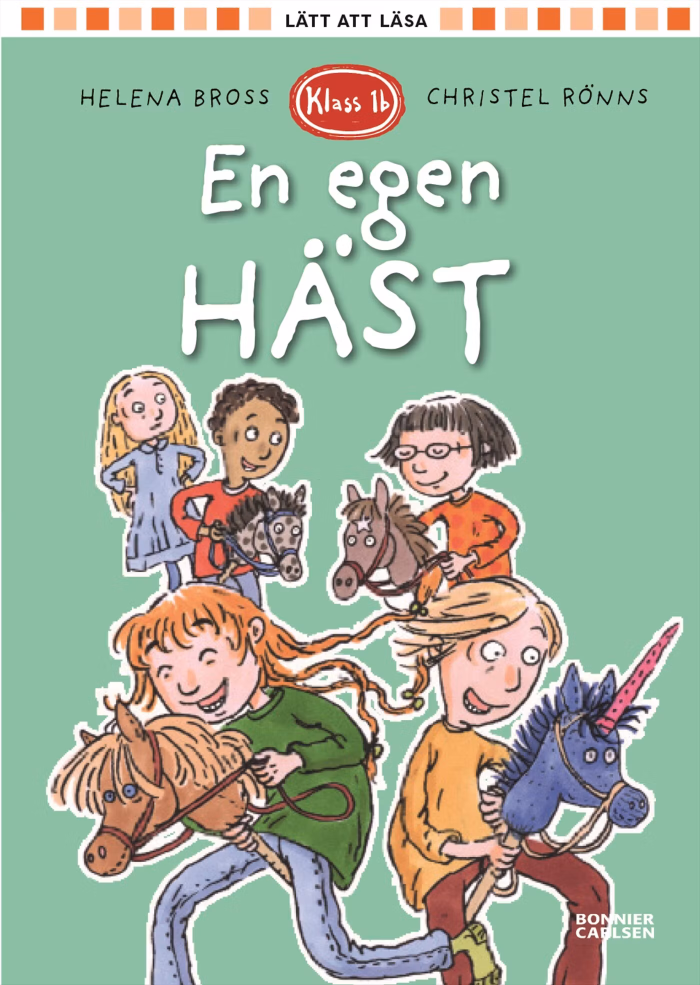 Helena Bross succéserie om kompisarna i ”Klass 1b” är lättlästa böcker för nybörjarläsare där både killar och tjejer kan känna igen sig. I dag berättar Alice att hon har börjat rida. Det vill Siri också göra, men hennes föräldrar säger att det är för dyrt. Det är så orättvist! På fritids får fröken en idé. Hon visar hur man kan göra en egen häst. En käpphäst! Vad kul! Alla vill vara med. Hästarna blir jättefina. Till och med Alice blir avundsjuk. Och det bästa av allt är att nu kan alla rida tillsammans …”En egen häst” är den tjugofemte fristående boken i serien om barnen i ”Klass 1b”. Läs också: "Spöket i skolan", "Starkast i klassen", "Hemliga kompisar", "Världens finaste glasögon", "Ny i klassen", "Tandligan", "Vilse i skogen", "Vi vill ha disco", "Skrik och bajs", "Ring 112!", "Hjälp, vi kommer för sent!", "Natt i skolan", "Bli sams", "Vilken vikarie!", "Småkrypsjakten", "Slagsmål", "Allra bästa kompisen", "Inbrott i skolan", "Hej, hello!", "Fira med fest", "Spela kula", "Ensamma i stan", ”Blir det kalas?” och "Skynda, skynda".