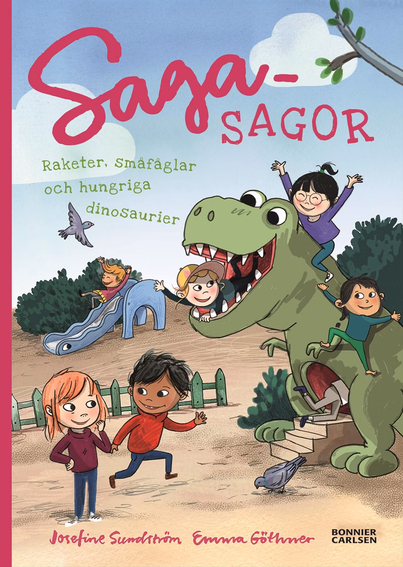 Nu är hon här igen – Saga Louisa Larsson! Josefine Sundström och illustratören Emma Göthner berättar i fem fristående kapitel om Saga fem år som bor tillsammans med sin familj i ett av ”Gladhusen” på Solrosvägen.Den här gången kämpar Saga för att hålla sig vaken på det sena nyårsfirandet tillsammans med släkten och storkusinerna, hon övervinner rädslan för gigantiska dinosaurier i en Dinopark, och en dag flyttar det in en ny familj i grannhuset. Saga står och spanar i fönstret när flyttgubbarna bär in en fågelbur i huset. Tänk, Saga som älskar djur!Inkännande och med ett genuint barnperspektiv beskrivs små men livsviktiga ögonblick i en fem/sex-årings vardag. Emma Göthners många pigga och inkännande illustrationer gör Sagasagor till en perfekt övergång från att läsa bilderbok till att börja läsa textböcker.Sagasagorna finns även som ljudböcker, i barnradion och som tv-filmer.Läs fler kapitelböcker om Saga:Sagasagor: studsmatta, simskola och en borttappad Tigertass, 2016. (Boken tilldelades priset: Din bok - Vårt val, Svenska Bokhandelsmedhjälpareföreningens årliga pris för bästa barnbok 2016.)Sagasagor: syskonsjuka, kämpaglöd och en envis framtand, 2017Sagasagor: fiffiga kroppen och finurliga knoppen, 2017 (i samarbete med Kronprinsessparets stiftelse Generation Pep)Sagasagor: bananbus, finskor och en superjobbig superhjälte, 2018Sagasagor: ballonglängtan, kurragömma och två tomtar i diket, 2019Bilderböcker om Saga:Den underliga julklappen, 2020Sagasagor ABC (en ABC-bok) 2021Läs tillsammans-böcker om Saga och kompisen Samir:Branden, 2020Stölden, 2020Såret, 2021