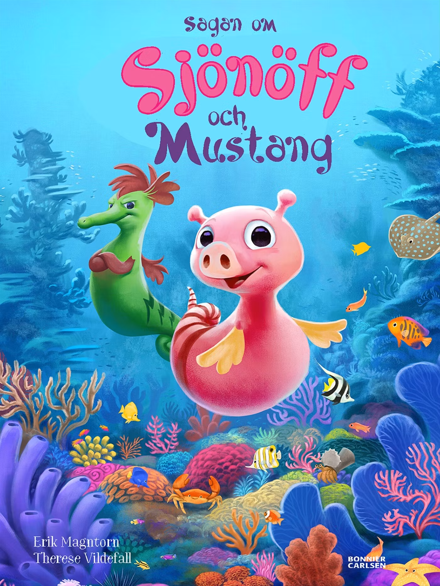 I Lilla palmviken bland koraller och färgglada fiskar lever de stolta sjöhästarna. Där bor också en annorlunda liten sjöhäst som vissa hånfullt kallar för Sjönöff, eftersom han har ett mjukt tryne istället för en smal och smäcker nos. En dag spolas Sjönöff och hans värsta plågoande Mustang upp på land när en stor våg drar fram över revet. De två små sjöhästarna verkar chanslösa mot solens gassande strålar och de vilda djuren på stranden. Men kanske kan Sjönöffs udda utseende bli en räddning där uppe på land? Erik Magntorns och Therese Vildefalls fantasifulla undervattenssaga tar med läsaren på ett äventyr bland rullande vågor, saltstänkta stränder och dansande sjöhästar.