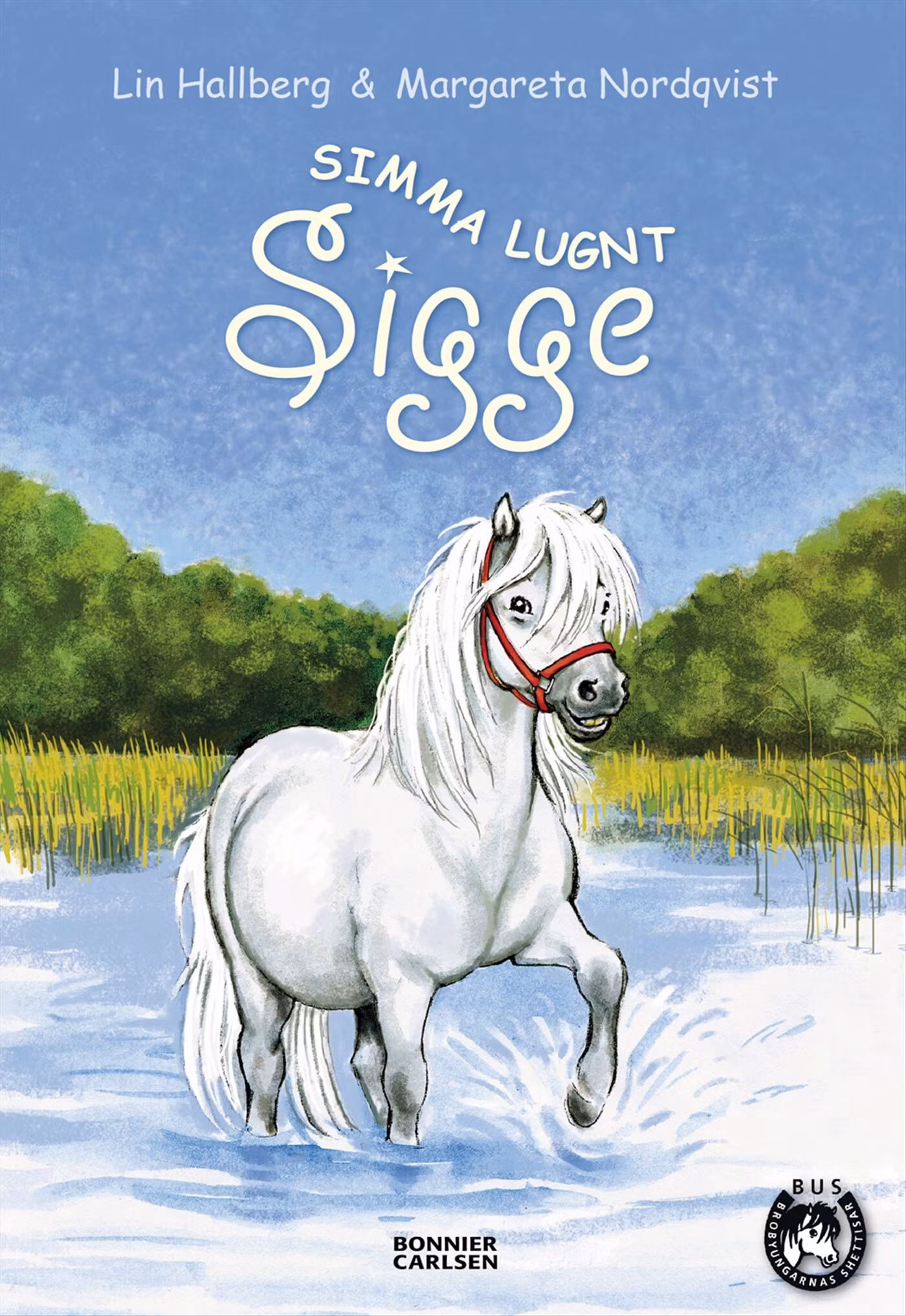 Sigge - hästböcker när de är som bäst!Allt det roliga är slut! Ridlägret är över och hästarna måste vila upp sig i hagen, och hos mormor och morfar finns det inga hästar. Eller vänta, finns det kanske en vit och en brun häst där i alla fall? Efter semestern väntar Sigge igen, och Ingela säger att han ska få följa med på Elinas allra första tävling!””Simma lugnt Sigge” ingår i BUS-serien (Brobyungarnas shettisar), som handlar om ponnytjejen Elina och hennes kompisar. De håller till i det mysiga shettisstallet i Broby, som drivs av Ingela, världens bästa ridlärare! Här möter Elina Sigge, den sötaste lilla shetlandsponny hon någonsin har sett. Margareta Nordqvists bedårande bilder är i perfekt samklang med Lin Hallbergs säkra text.Både ”Alla älskar Sigge” och “Kom igen Sigge” har prisbelönats av Bokjuryn - Barnens egen topplista över årets bästa böcker. Böckerna har även lovordats av såväl kritiker som biblioteksanställda.