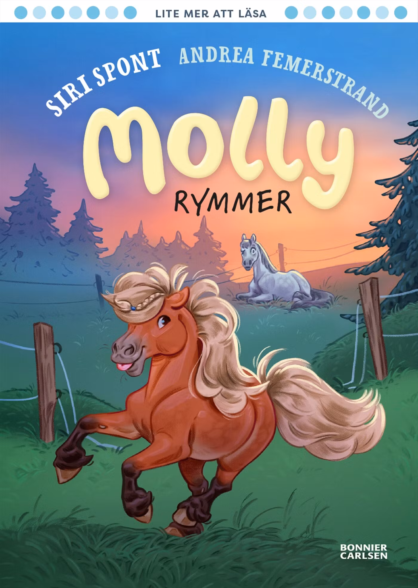 Tredje boken i den lättlästa serien MOLLY, som handlar om hur det är att bo på landet och ha häst på riktigt: lerigt, slitigt och alldeles, alldeles underbart! Hurra! Ebba har sommarlov och ser fram emot härliga sovmorgnar och häng med sin bästis! Nu när hon hjälpt till med höskörden kan lovet äntligen börja på riktigt. Eller? Sommarplanerna går i kras när storasyster Fanny får sommarjobb. Då måste ju Ebba ta ansvar för hästarna. Även morgonfodringen … Så får Fanny en idé: Molly och Kotte kan få semester och gå på bete. En drömlösning för alla! Men så rymmer Molly. Och inte bara en gång… En bok om hästliv på riktigt, skriven med värme av Siri Spont. Drömmiga och humoristiska illustrationer signerade Andrea Femerstrand. Böckerna om Molly ligger på Bonnier Carlsens lättläst-nivå ”Lite mer att läsa”, och är perfekta för barn som lästränar och vill ha böcker med mycket bilder och lite längre stycken text.