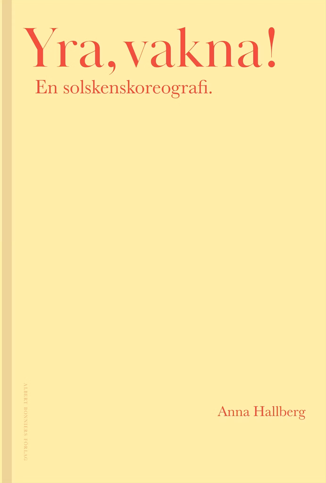 ”Det var ett lugn som kom starkt, plötsligt, med en smäll.” Lyckan i att inte veta. Något kommer snart att hända. Yra, vakna! är en diktsamling som utspelar sig på en scen. Maria berättar för sig själv om att följa solen. Vid scenkanten sitter två män och dinglar med benen. På golvet rör sig figuriner i olika rutiner. Poesin tar plats, backar undan, kliver fram igen. Om det går att göra rum för en händelse. Om det är möjligt att ta emot ljus och lek, vad som trots allt lever.