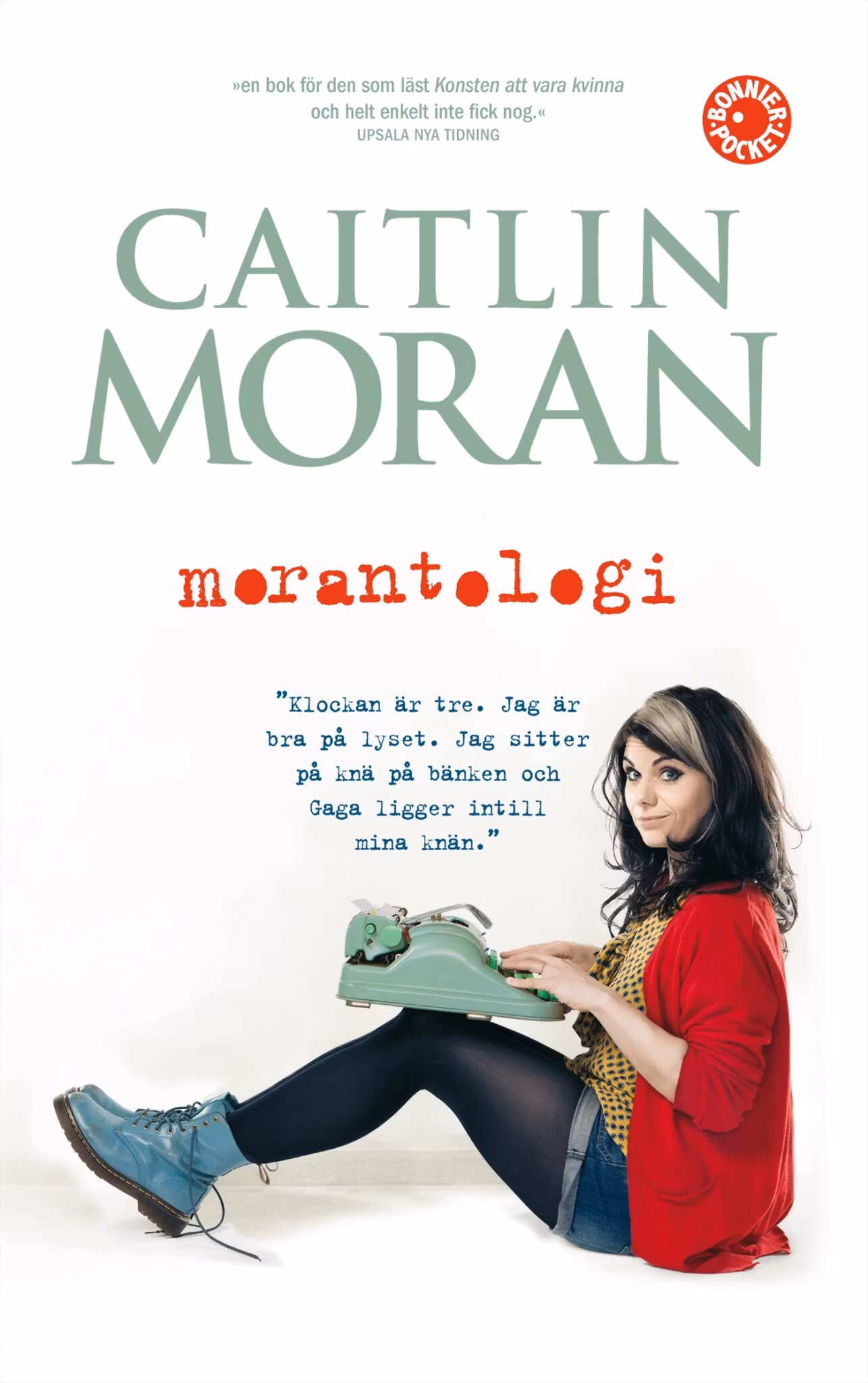 ”I KONSTEN ATT VARA KVINNA var jag begränsad till ett enda ämne: kvinnor. Deras hår, deras skor och att de är tända på Aslan från Häxan och lejonet (något som jag VET är en universell sanning).Men! I min nya bok MORANTOLOGI – som titeln antyder – är jag fri att ta mig an RESTEN AV VÄRLDEN: Ghostbusters, Twitter, koffein, panikattacker, Michael Jacksons begravning, att vara en medelklassmarijuanapundare, Doctor Who, helgfyllor, Downton Abbey, min egen tragiskt förtidiga död och min återkommande oförmåga att få någon att börja använda det smeknamn jag valt åt mig själv: ’Puffis’.Jag går på sexklubb med Lady Gaga, gråter på Paul McCartneys gitarr, medverkar som gnom hos Richard & Judy, går ombord på TARDIS, sniffar på Sherlock Holmes kuddar på Baker Street 221B, skriver Amy Winehouses dödsruna, samt kommer för sent till premiärministern på Downing Street. Och tiden som blir över – mellan baksmällorna – går jag på om välfärdsstaten, stängda bibliotek och fattigdom: som en lite sämre Dickens eller Orwell, men med tuttar.”