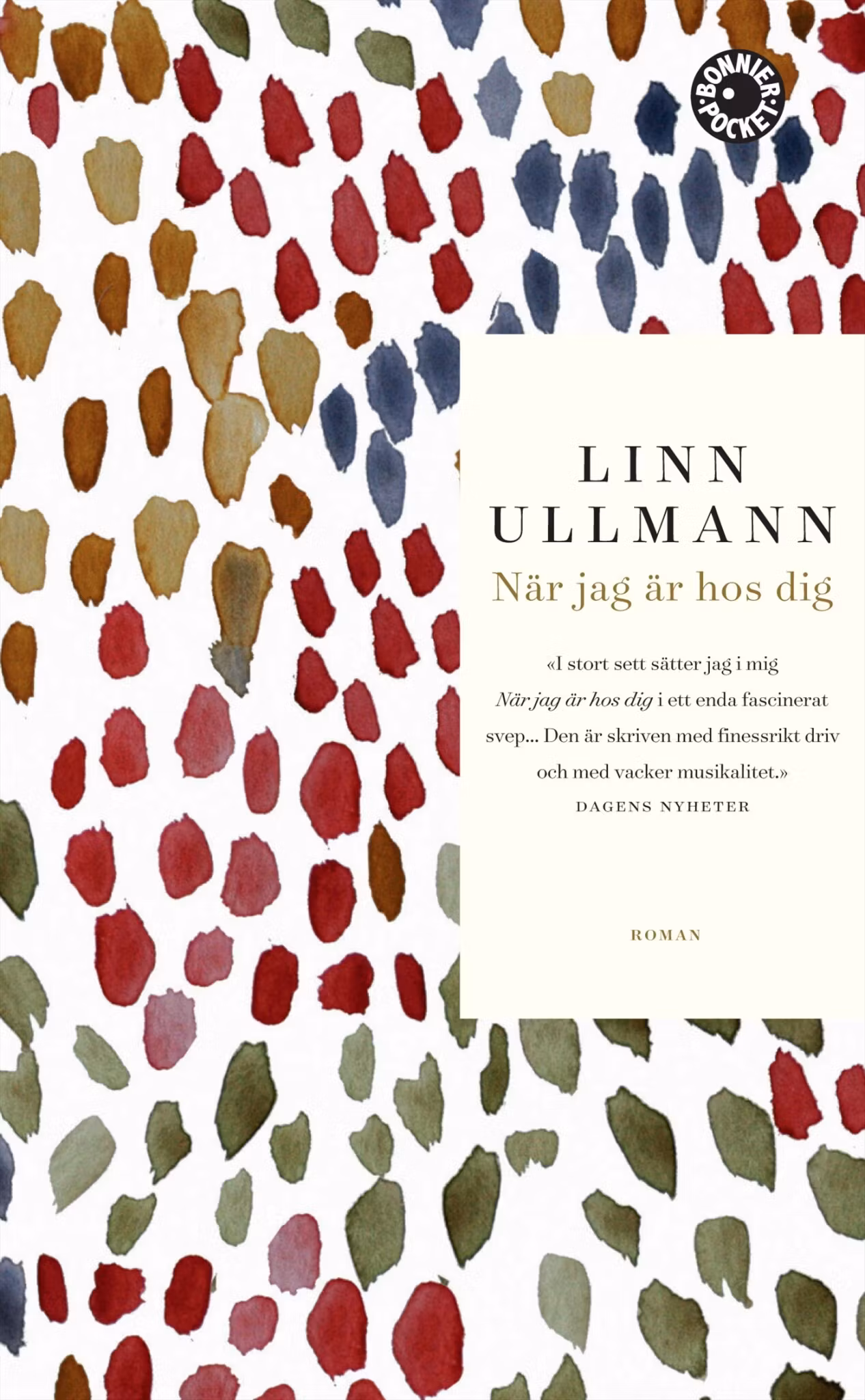 När jag är hos dig är historien om ett fall. Sjuksköterskan Stella står på taket tillsammans med sin man Martin, och plötsligt förlorar hon fotfästet. Med filmisk skärpa beskriver Linn Ullmann fallet ur en rad perspektiv. Var det en olyckshändelse eller blev hon knuffad? Ur skildringen av Stellas död växer en sorgsen och humoristisk historia fram om hur Martin och hon en gång träffades tack vare en avokadogrön soffa. Men lika mycket är detta historien om alla de som levt före, med och vid sidan av Martin och Stella. Där finns döttrarna Amanda och Bi och den knarrige Axel som lever för pariserhjul och musik, där finns Nordens första strutsfarm och en trollkarl som kan trolla bort människor på riktigt.